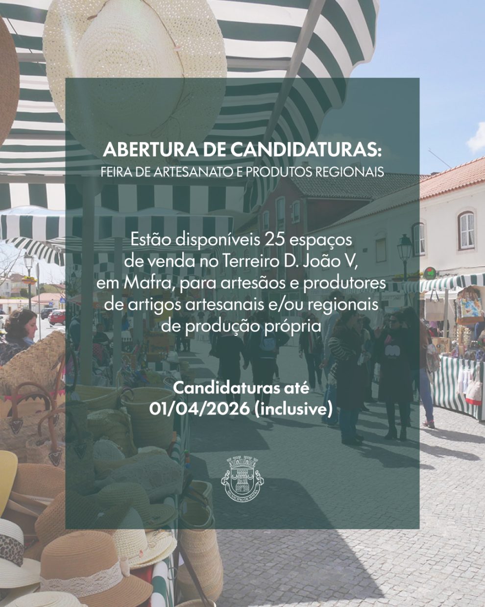 Está a decorrer, até ao dia 1 de abril (inclusive), o prazo de apresentação de candidaturas para atribuição de 25 espaços de venda na Feira de Artesanato e de Produtos Reginais, que decorre ao primeiro fim de semana de cada mês, de abril a outubro, no Terreiro D. João V, em Mafra.