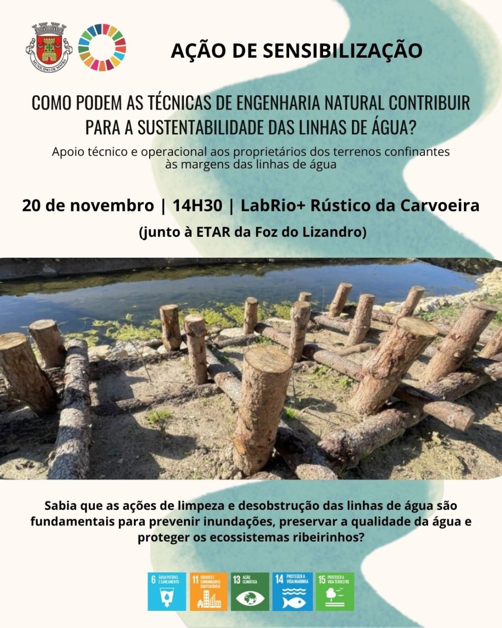 Como podem as técnicas de engenharia natural contribuir para a sustentabilidade das linhas de água? Se é proprietário de um terreno confinante a uma linha de água, ou tem interesse pela proteção dos recursos hídricos, participe na ação de sensibilização sobre sustentabilidade e técnicas de engenharia natural na reabilitação fluvial, que se realiza no dia 20 de novembro, pelas 14h30, no LabRios+ Rústico da Carvoeira (junto à ETAR/ Fábrica da Água).