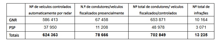 Relativamente à velocidade, foram controlados 624.363 veículos pelas Forças de Segurança (GNR e PSP).