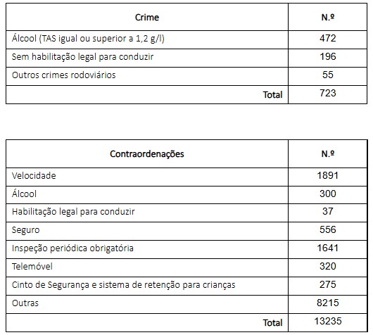 Do total dos veículos fiscalizados/controlados, foram registadas 13.235 infrações, distribuídas conforme quadro abaixo, resultando numa taxa de infração (n.º total de infrações/n.º total de condutores/veículos fiscalizados) de 1,9 %.
