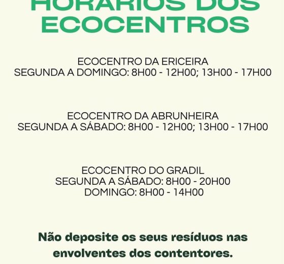 Geral Horários dos Ecocentros Adicionar comentário Sabia que, no Concelho de Mafra, existem três ecocentros que permitem...