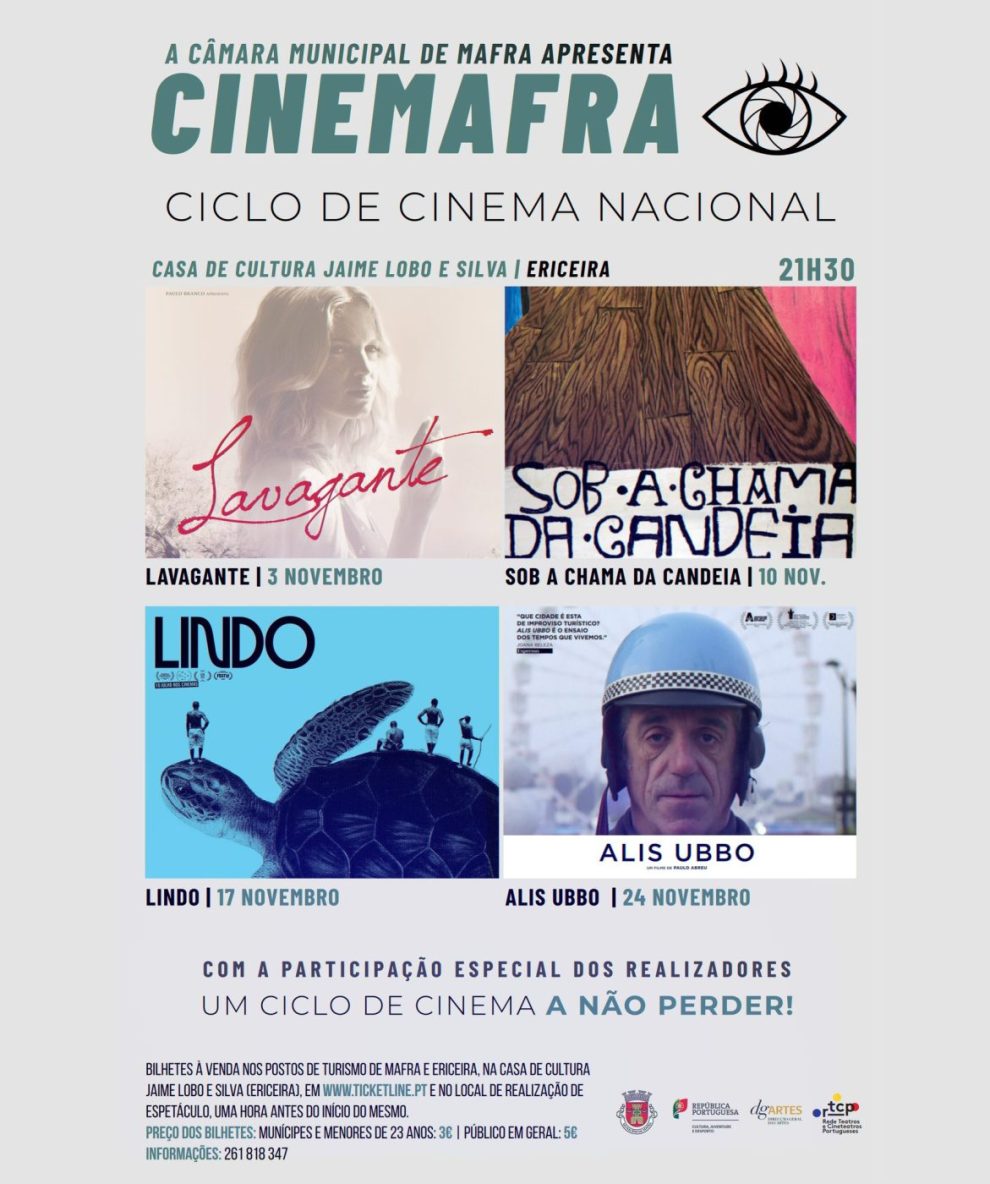 No mês de novembro, o CineMafra viaja até à Casa de Cultura Jaime Lobo e Silva (Ericeira), com um ciclo de cinema especialmente dedicado às produções nacionais. Os filmes serão exibidos sempre à segunda-feira, às 21h30. Não perca: “Lavagante”, no dia 3; “Sob a chama da candeia”, no dia 10; “Lindo”, no dia 17; e “Alis Ubbo”, no dia 24.