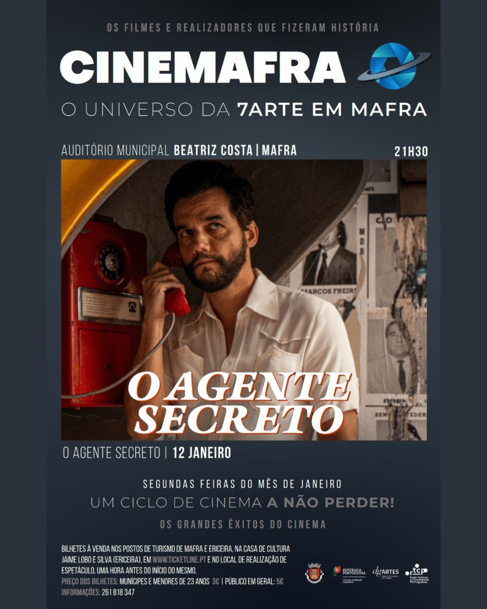 Bilhetes à venda nos Postos de Turismo de Mafra e Ericeira, na Casa de Cultura Jaime Lobo e Silva (Ericeira), em www.ticketline.pt/evento/cinemafra-o-agente-secreto-100499 ou no local de exibição do filme, uma hora antes do início do mesmo.