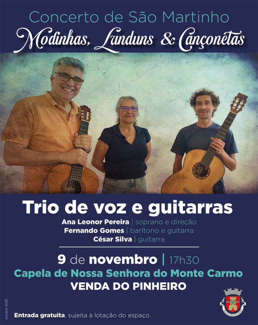 O concerto, que assinala o Dia de S. Martinho, é protagonizado pelo trio de voz e guitarras, composto por Ana Leonor Pereira (soprano e direção), Fernando Gomes (barítono e guitarra) e César Silva (guitarra).