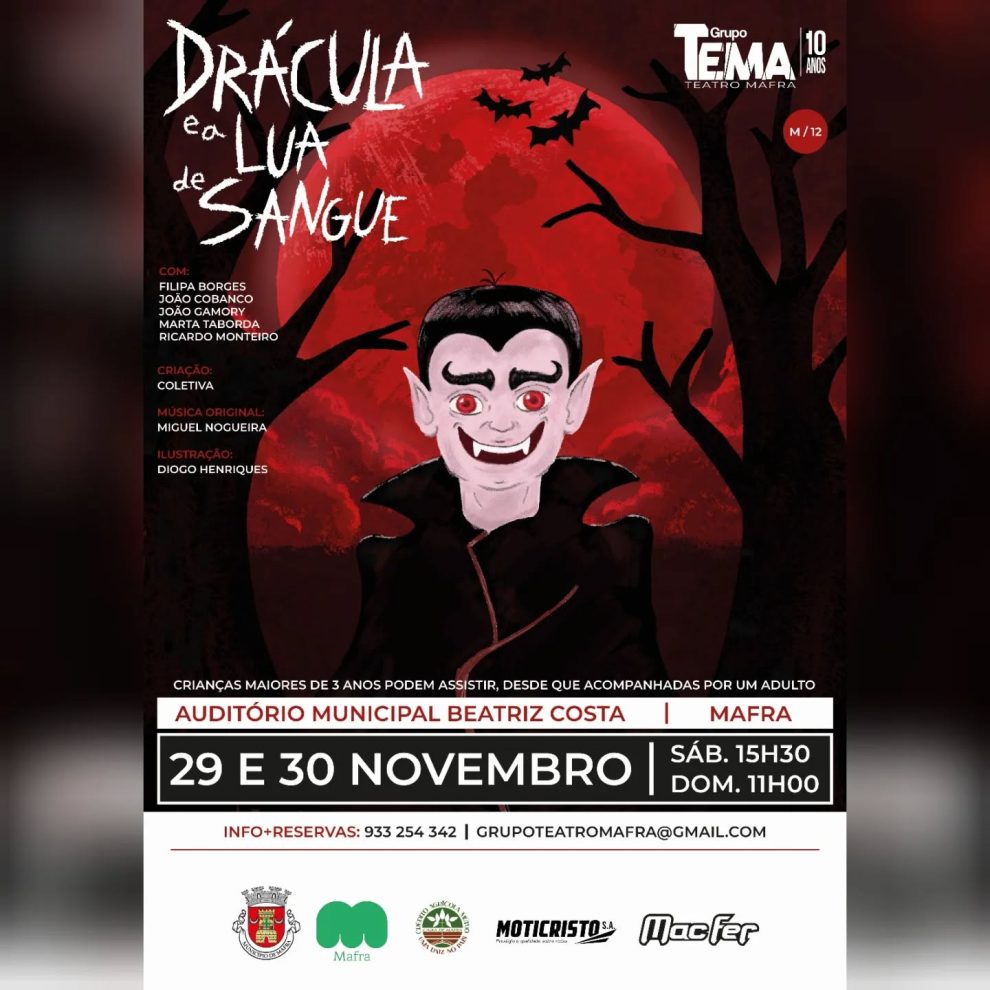O Grupo TEMA – Teatro Mafra apresenta a sua nova produção infantil “Drácula e a Lua de Sangue”, uma história de terror onde o conhecido vampiro é retratado de forma desconcertante e divertida. “Drácula e a Lua de Sangue” vai a cena nos dias 29 e 30 de novembro, no Auditório Municipal Beatriz Costa, em Mafra. As sessões realizam-se às 15h30 do dia 29 (sábado) e às 11h00 do dia 30 (domingo).