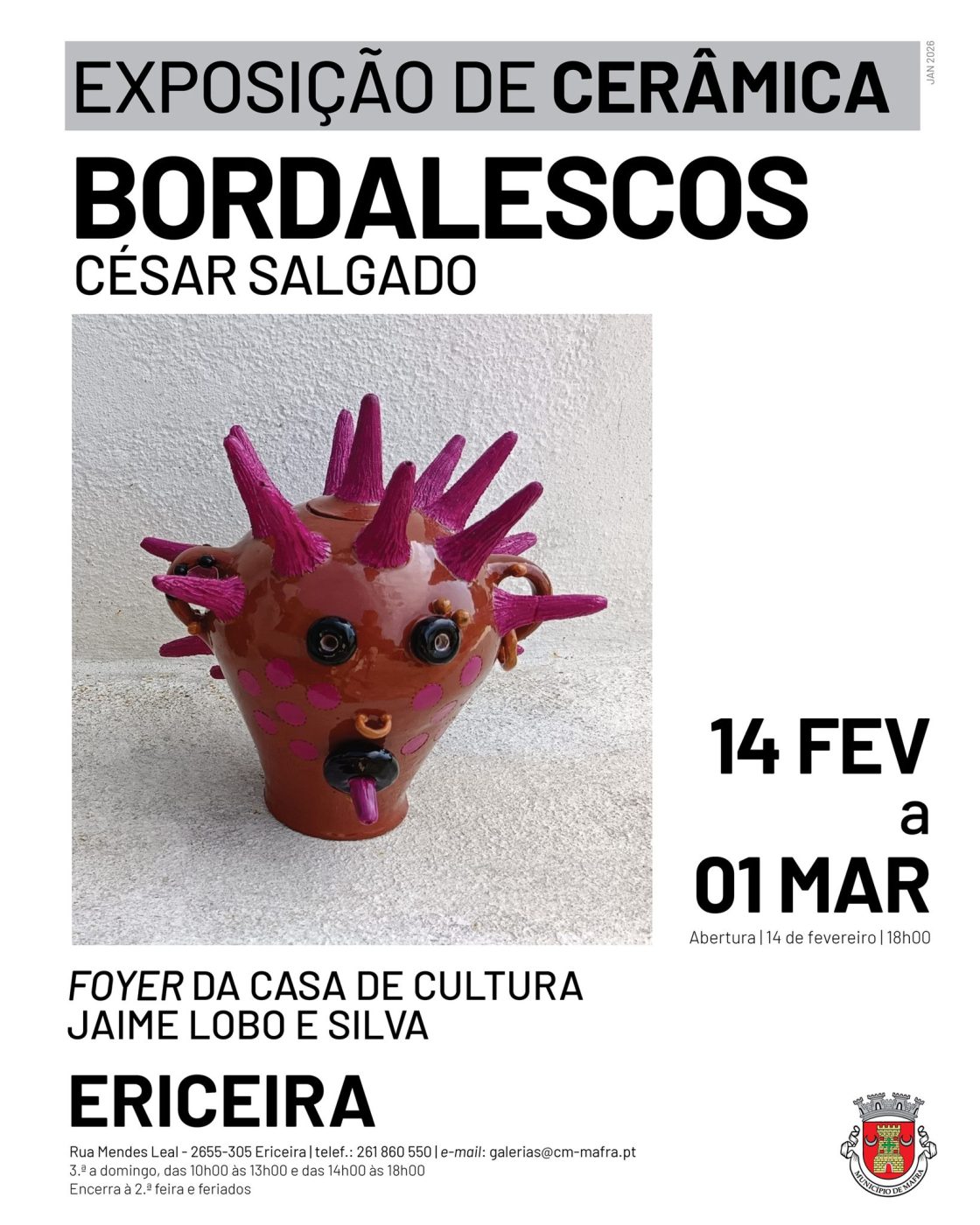 De 14 de fevereiro a 1 de março, visite três exposições dedicadas à memória, cultura e olaria satírica, incluindo uma retrospetiva dos trabalhos que marcaram a arte municipal em 2025.