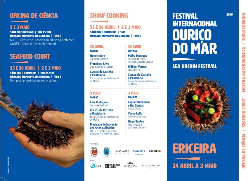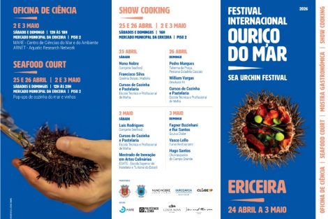 Assim, no dia 25 de abril, às 12h, as portas do Mercado Municipal da Ericeira abrem-se para a inauguração de mais uma edição do Festival Internacional do Ouriço do Mar. Além do já conhecido seafood court que funcionará das 12h às 20h dos dias 25 e 26 de abril e 2 e 3 de maio com várias sugestões de cozinha do mar e vinhos da região (de Mafra e de Lisboa), nos dias 2 e 3 de maio realizar-se-á uma oficina de ciência, conduzida pelo MARE (Centro de Ciências do Mar e do Ambiente), Politécnico de Leiria e ARNET – Aqua Research Network para quem quiser saber mais sobre o ecossistema marinho e o ciclo de vida do ouriço do mar.