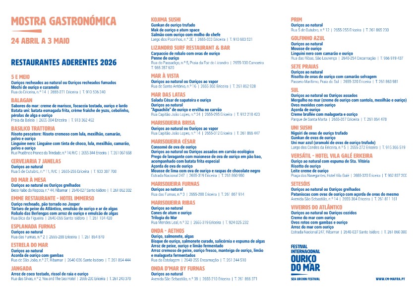 “A realização do Festival Internacional do Ouriço do Mar assume uma importância estratégica para o Município de Mafra ao consolidar a Ericeira como um destino gastronómico de excelência e ao valorizar um recurso que está na génese da nossa identidade. Mais do que um evento, esta é uma plataforma de dinamização da economia local e da restauração, que alia a tradição da nossa comunidade piscatória à inovação científica e à sustentabilidade dos oceanos. Ao promovermos este “Caviar do Atlântico”, estamos a projetar o nome de Mafra além-fronteiras e a reafirmar o nosso compromisso com a preservação do património marinho.” Hugo Moreira Luís (Presidente da Câmara Municipal de Mafra)