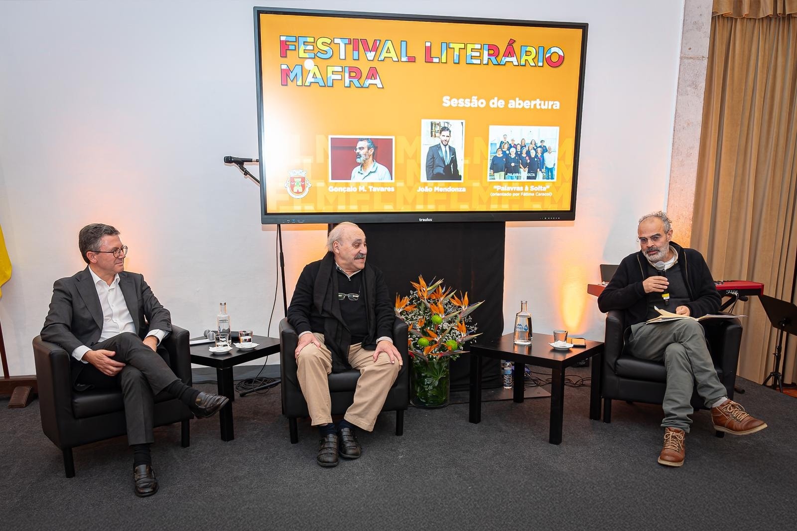 Na sessão de abertura deste festival, participaram o Presidente da Câmara Municipal de Mafra, Hugo Moreira Luís, o Comissário do Festival, José Fanha, e o reconhecido autor Gonçalo M. Tavares. Seguiu-se um momento musical com o soprano João Mendonza e um apontamento pelo projeto “Palavras à Solta”, dirigido por Fátima Caracol.