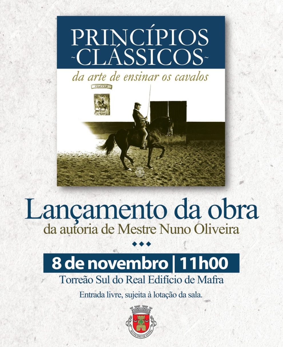 No ano em que se assinala o centenário do nascimento do Mestre Nuno Oliveira, figura maior da Equitação Clássica mundial e fundador da escola equestre da Quinta do Brejo, localizada na Avessada, o Município de Mafra leva à estampa a edição comemorativa de “Princípios Clássicos da Arte de Ensinar os Cavalos”. O lançamento do livro está marcado para o dia 8 de novembro, às 11h00, no Torreão Sul do Real Edifício de Mafra.