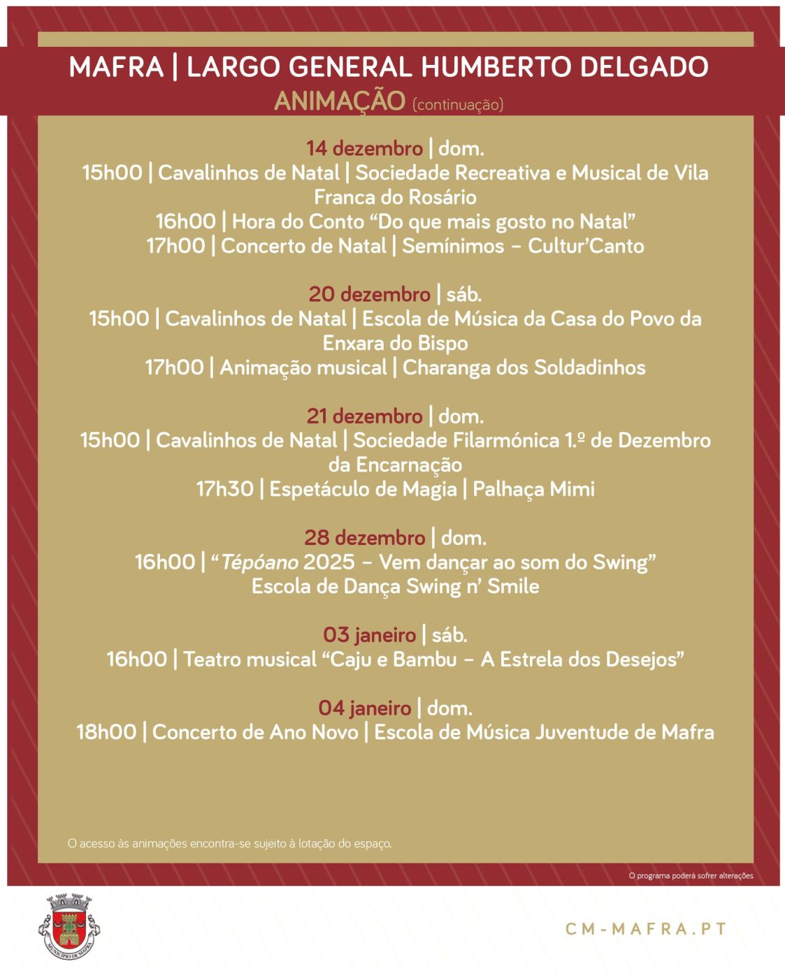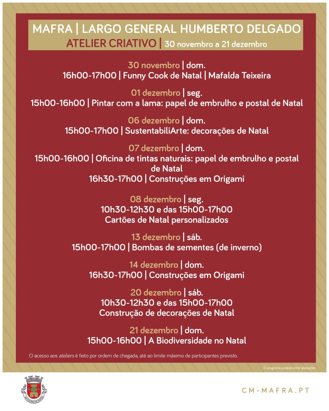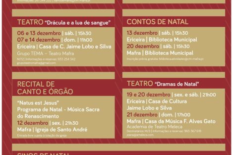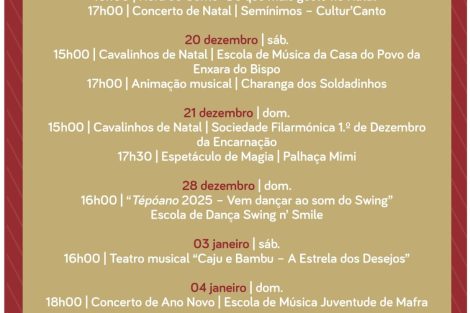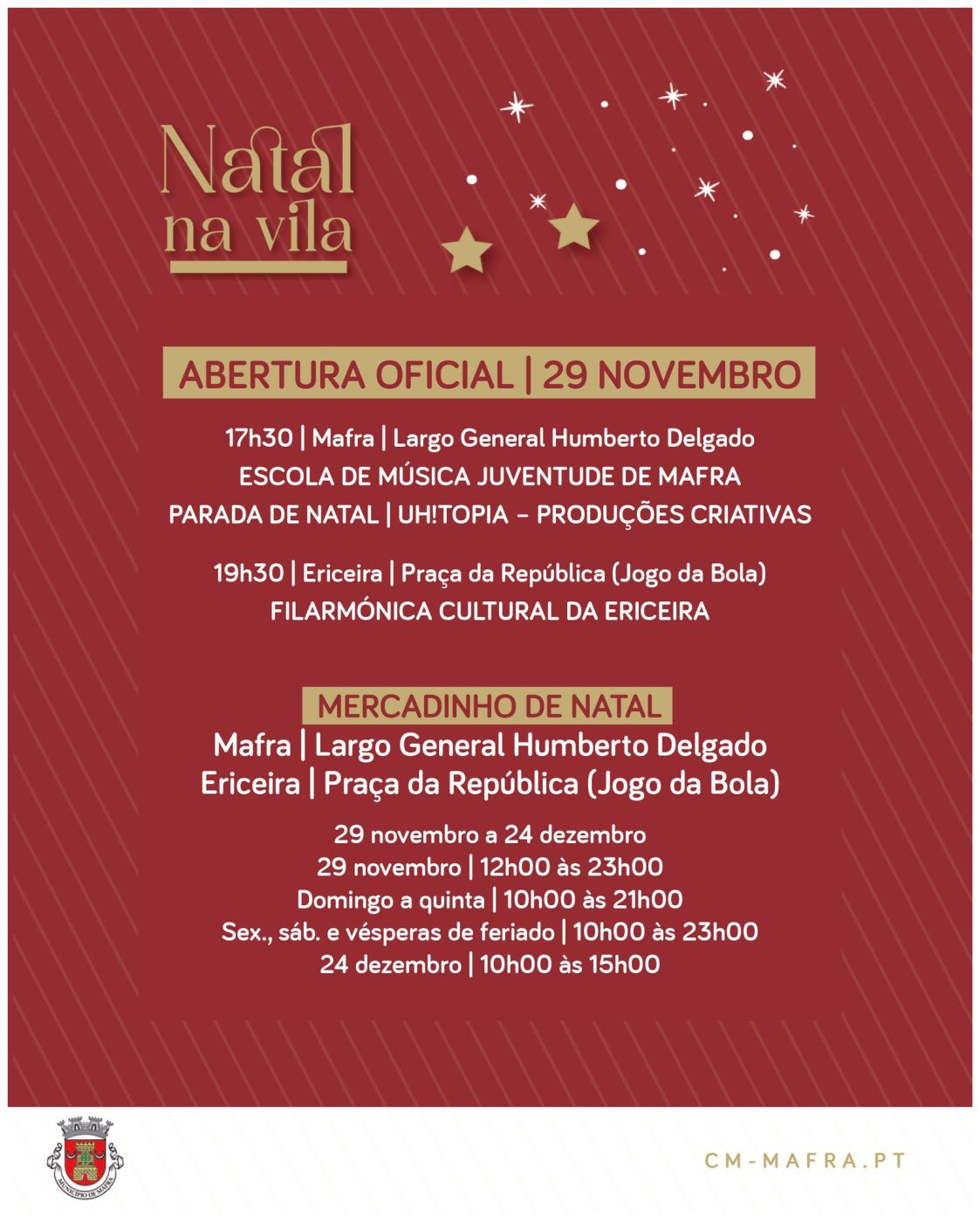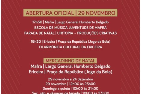 A abertura oficial do “Natal na vila” está marcada para o dia 29 de novembro, às 17h30, no Largo General Humberto Delgado (Mafra), e às 19h30, na Praça da República – Jogo da Bola (Ericeira).