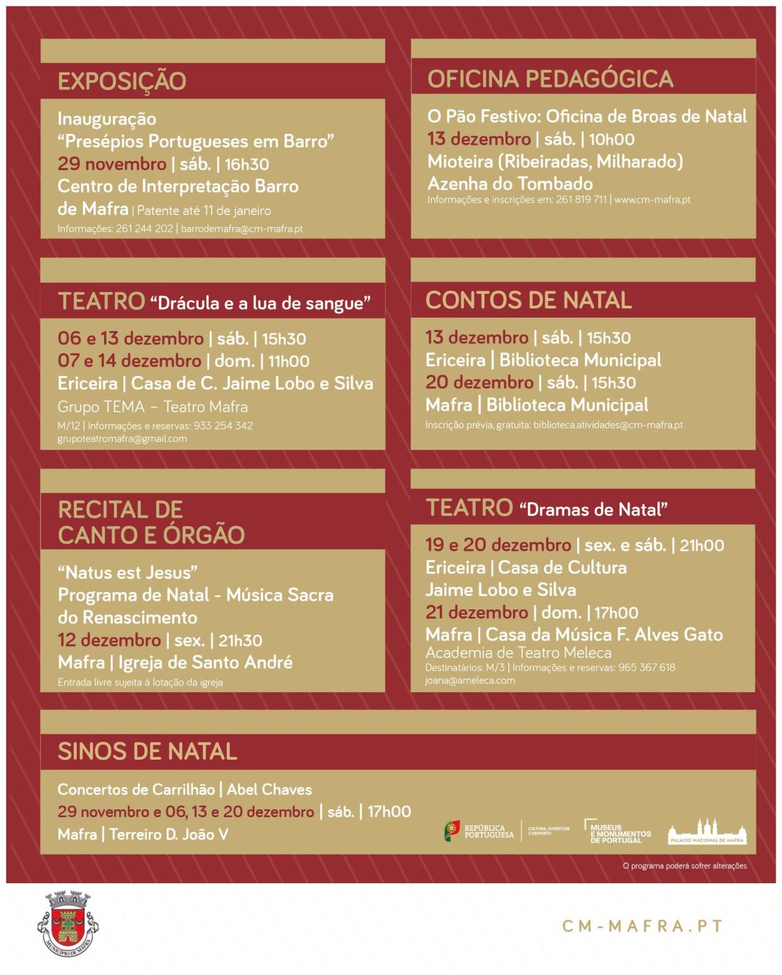 Carrossel, pista de gelo, circo, animação de rua, atividades infantis e o tradicional Mercadinho de Natal. De 29 de novembro a 6 de janeiro, a quadra natalícia volta a encher de alegria as ruas das vilas de Mafra e da Ericeira.