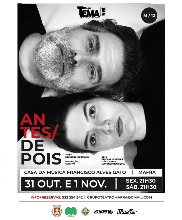Nos próximos dias 31 de outubro e 1 de novembro, o Grupo TEMA – Teatro Mafra volta a levar a cena o espetáculo “Antes/Depois”, numa reflexão sobre o amor e as relações, o seu desenvolvimento e o seu fim. A peça sobe ao palco da Casa da Música Francisco Alves Gato (Mafra), às 21h30.