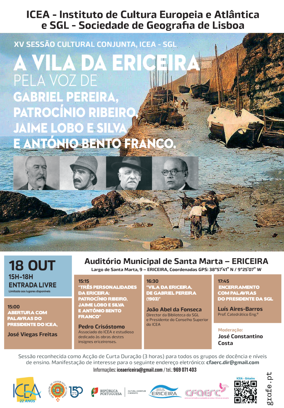 No próximo dia 18 de Outubro, entre as 15h e as 18h, irá decorrer a XV Sessão Cultural Conjunta, ICEA – SGL, intitulada como A Vila da Ericeira pela voz de Gabriel Pereira, Patrocínio Ribeiro, Jaime Lobo e Silva e António Bento Franco no Auditório Municipal de Santa Marta, Largo de Santa Marta, 9 – Ericeira. A entrada é livre (limitada aos lugares disponíveis).